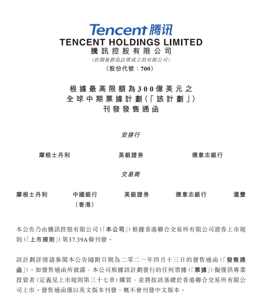 4月14日午间,腾讯控股在港交所发布公告称,可能会不时发行中期票据,总面值不得超过300亿美元。