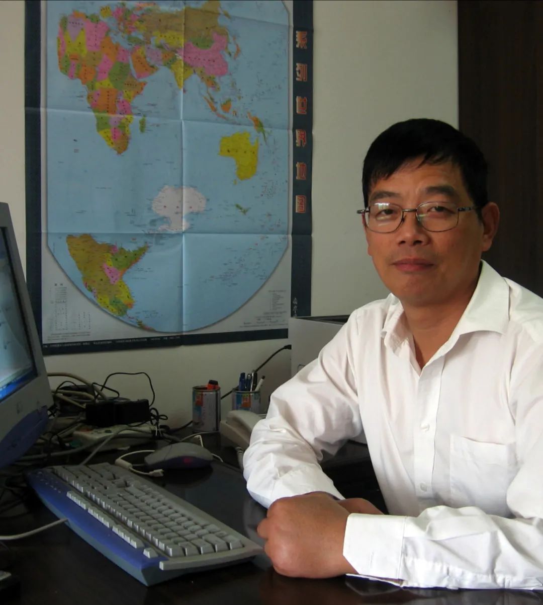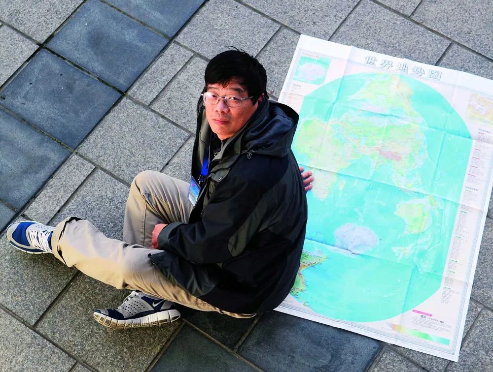 中国科学院精密测量科学与技术创新研究院郝晓光研究员与他创新编制的竖版世界地图。