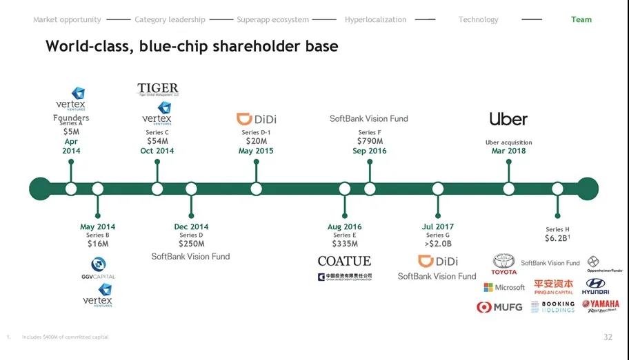 截至目前Anthony Tan Ping Yeow持股为2.2%,拥有60.4%的投票权;软银持股为18.6%,有7.6%的投票权;Uber持股为14.3%,有5.8%的投票权;滴滴持股为7.5%,有3.1%的投票权;Toyata Motor持股为5.9%,有2.4%的投票权。