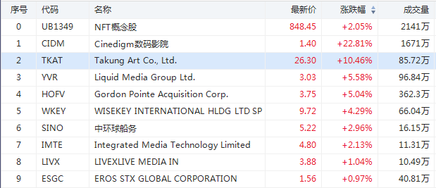 华盛资讯4月14日消息,美股盘初,NFT概念多数走强,Cinedigm数码影院(CIDM)涨近23%,香港大公文化(TKAT)涨超10%。