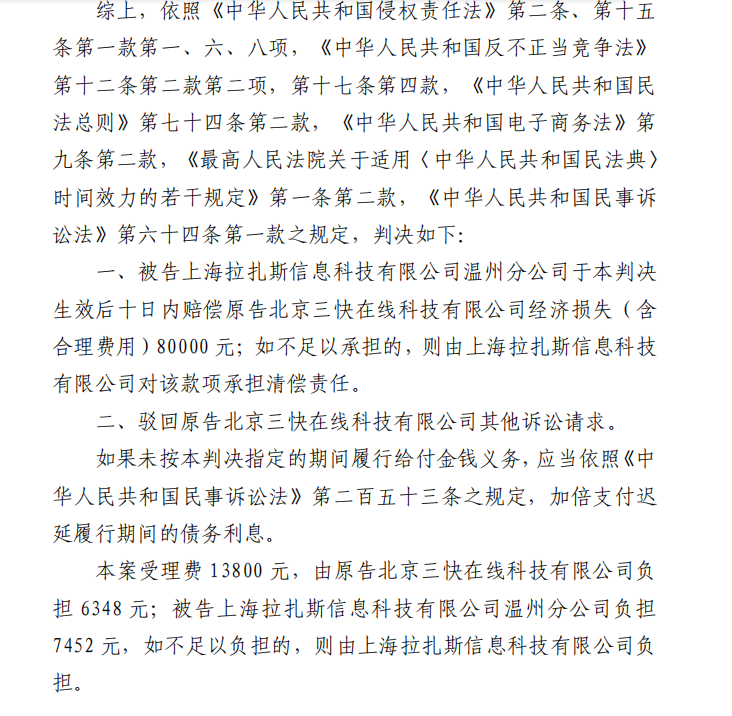 最后温州市中级人民法院判决,被告上海拉扎斯信息科技有限公司温州分公司违反《中华人民共和国反不正当竞争法》第十二条第二款第二规定的不正当竞争行为,损害了原告的合法权益应承担相应的民事责任。要求被告上海拉扎斯信息科技有限公司温州分公司赔偿原告北京三快在线科技有限公司经济损失(含合理费用)80000元,不足以承担的,则由上海拉扎斯信息科技有限公司对该款项承担清偿责任。驳回了北京三快在线科技提出要求被告在饿了么首页以及《温州日报》上刊登声明、消除影响的请求。