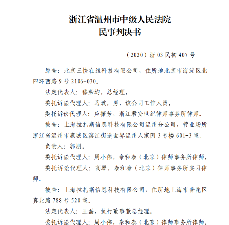 近日,浙江省温州市中级人民法院发布一份民事判决书。该案件的原告和被告分别为国内两大外卖巨头,美团和饿了么的运营公司,北京三快在线科技有限公司和上海拉扎斯信息科技有限公司及其温州分公司。
