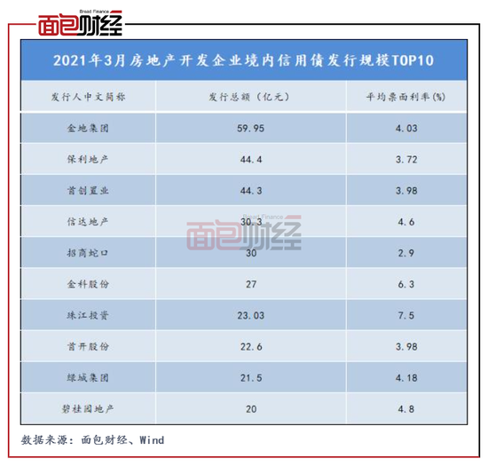 根据Wind数据,2021年3月,在新发行境内信用债的房企中,金地集团发行信用债融资最多,金额为59.95亿元,平均票面利率为4.03%;其次为保利地产,融资金额为44.4亿元,平均票面利率为3.72%。