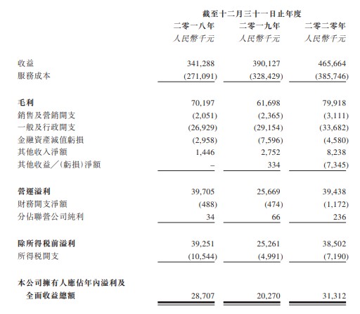 公司所有收益来自提供环境清洁及维护服务。截至2018年、2019年及2020年12月31日至年度,收益分别约为人民币3.413亿元、人民币3.901亿元及人民币4.657亿元。其中,来自物业清洁服务的收益分别占总收益的约89.5%、93.5%及 96.0%。同期,纯利分别约为人民币2870.7万元、人民币2027万元及人民币3131.2万元。