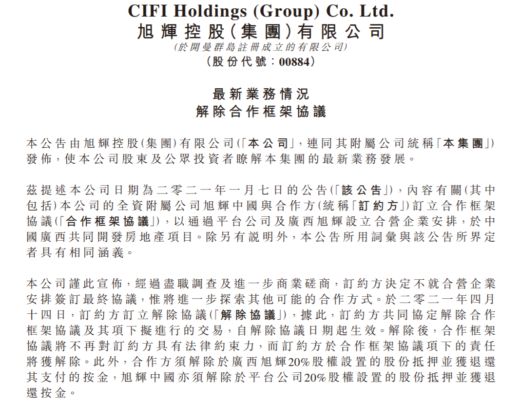 4月14日晚间,旭辉控股集团(00884.HK)发布公告称,将解除与彰泰集团的合作框架协议。
