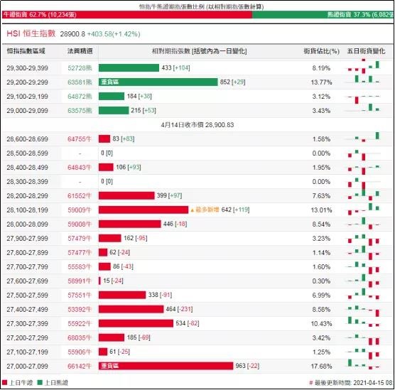 街货分布方面,至周三,恒指牛证街货重货区在收回价27000点至27500点之间,累计相当约2207张期指合约;恒指熊证街货重货区在收回价29000点至29400点之间,累计相当约1684张期指合约。