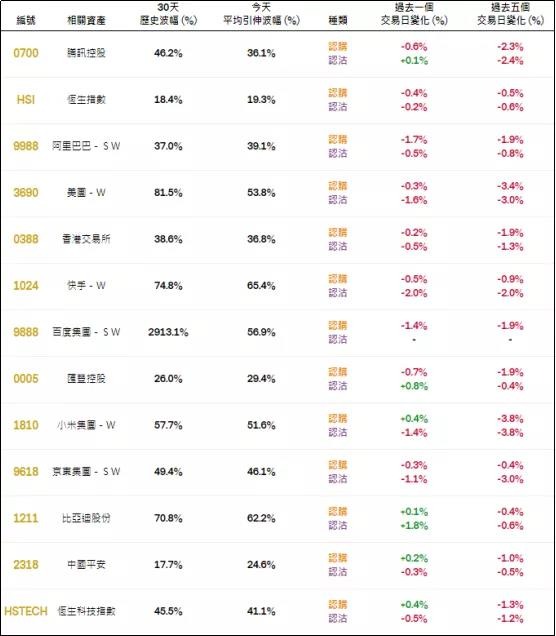 周三恒指相关权证的平均引伸波幅约19.3%,按日略有调降。个股方面,阿里、百度相关认购证的引申波幅按日调降显著;而小米、比迪、平安及恒生科技指数相关认购证的引申波幅则按日略有调升。