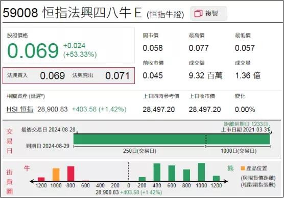 1、强势轮证:恒指法兴四八牛(59008.HK),周三上涨53.33%;