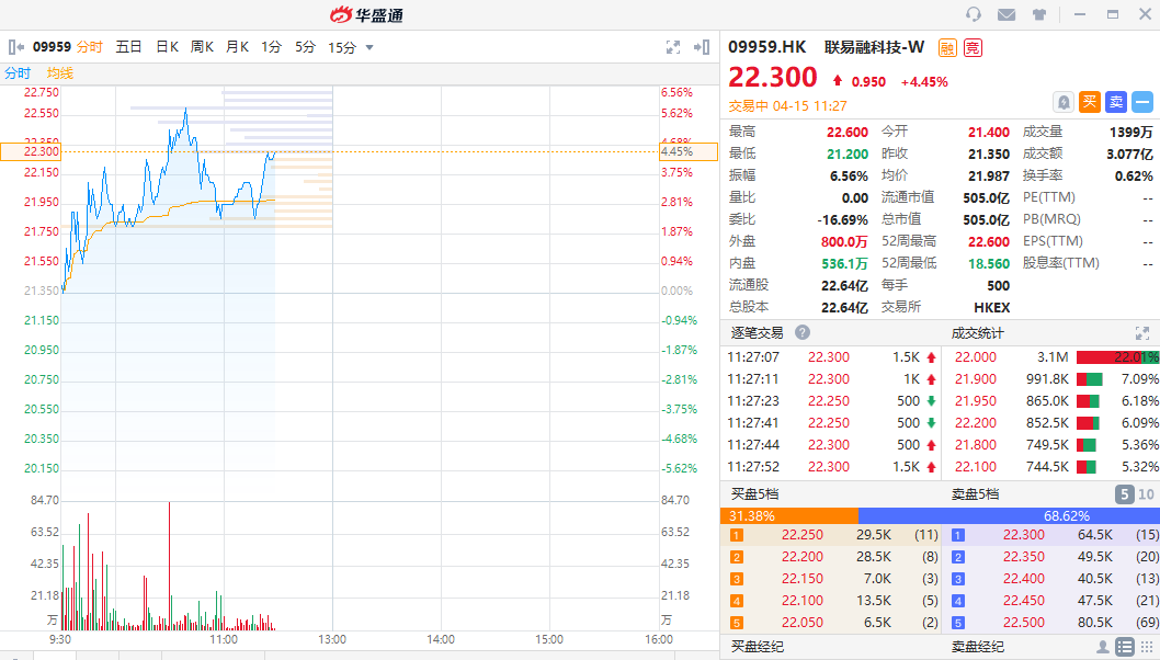 华盛资讯4月15日消息,次新股联易融今日持续上涨,最高见22.6港元创上市新高。截至发稿,联易融涨4.15%,现报22.3港元每股,成交额达3.077亿港元,最新总市值为505亿港元。
