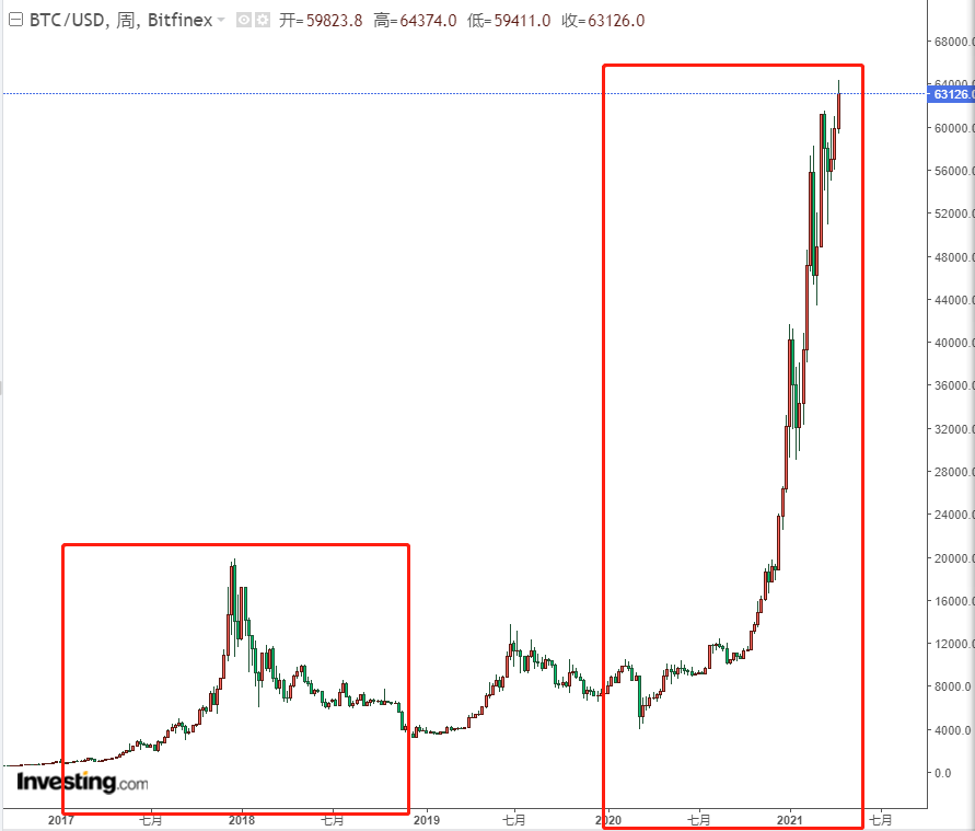 另一方面,整个加密货币市场如此快速和疯狂地上涨,更多的是过度投机的结果。翻看比特币历史走势就可以看到,自2017年初到2018年末,比特币走势就完成了先涨10倍,再跌去80%以上的过山车壮举,疯狂加杠杆炒作的现象非常明显。再看自2020年初到现在的情况,比特币又上涨超过10倍了,历史会不会有重演的可能?