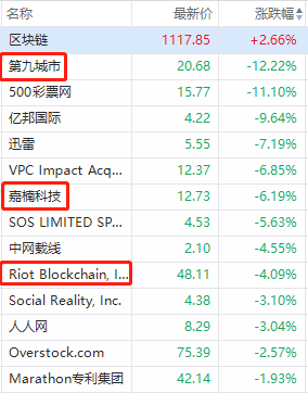 值得注意的是,在Coinbase上市交易后,美股上市的区块链概念股出现较大幅度的下跌。Coinbase上市当天,Marathon跌近16%,Riot Blockchain也大跌15.36%,中概股亿邦国际、第九城市、嘉楠科技等跌幅都超过7%。隔夜这几只主要的概念股继续大跌,其中跌幅最大的第九城市续跌12.22%,嘉楠科技也续跌6.19%。