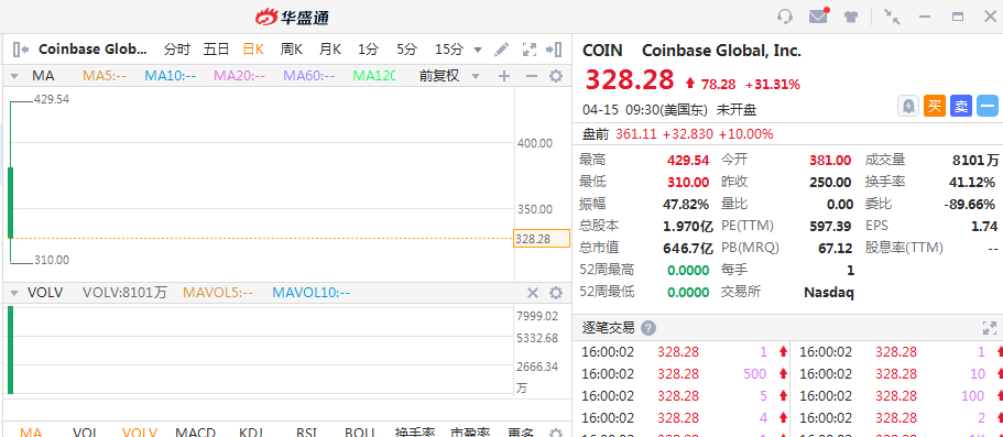 华盛资讯4月15日消息,美股盘前,Coinbase(COIN)续涨10%,隔夜上市首日收涨超31%,盘中交易时市值一度突破1000亿美元。昨日,ARK旗下三支ETF买入Coinbase近75万股,以收盘价计算规模约2.5亿美元。