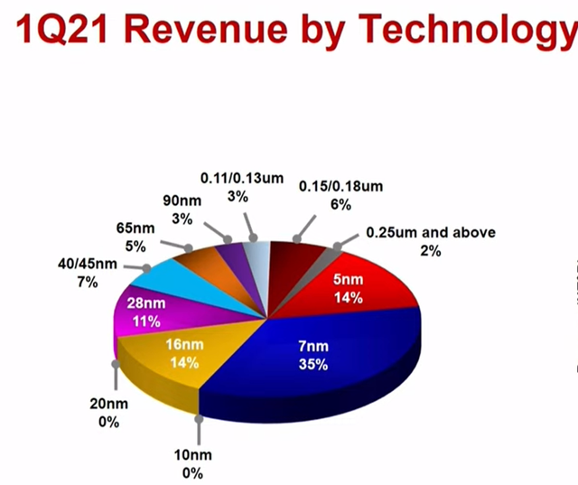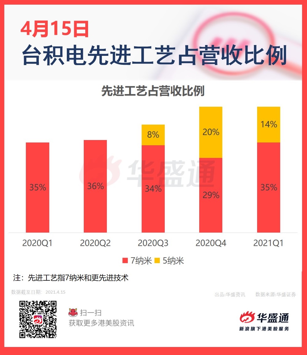值得注意的是,台积电5纳米工艺首次量产是在2020年Q3,当季就贡献了8%的营收占比,在去年的Q4,更是增长到了20%。但是到了2021年Q1季度却缩减到14%。
