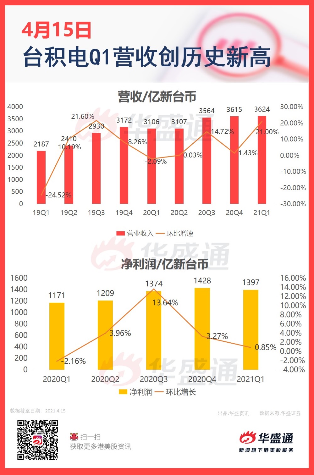 4月15日,台积电公布2021年Q1业绩。数据显示,1月-3月的收入总计为3624亿新台币,较2020年同期增长16.7%,连续三个季度创下新高;每股盈利5.39新台币,超市场预期盈利的5.17新台币,去年同期4.51新台币。