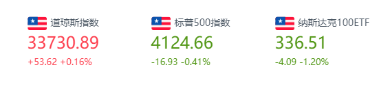 美股三大指数周三涨跌互现,其中道琼斯指数涨0.16%,报33730.89点;标普500指数跌0.41%,报4124.66点;纳斯达克综合指数跌0.99%,报13857.84点。