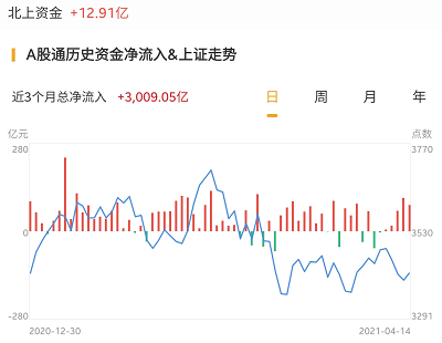 北上资金今日净流入12.91亿元,上日为净流入超81亿元。