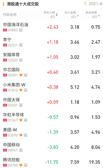 个股方面,今日南下资金净买入中国海洋石油2.43亿港元,为今日买入之最。此外,南下资金依次净买入李宁1.18亿港元,安踏体育1.05亿港元。