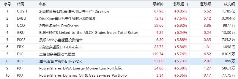 美股上个交易日涨幅前十的ETF