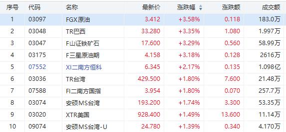 受油价大涨的消息影响,今日港股涨幅居前的ETF主要有FGX原油涨3.58%;F三星原油期涨3.18%,成交额2616万港元。
