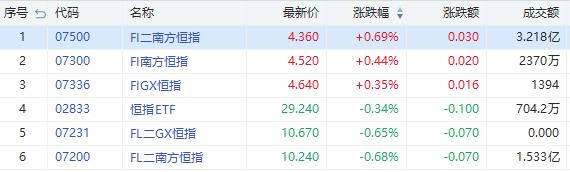 看多恒指的ETF走弱,南方两倍看多恒指(07200.HK)跌0.68%,成交额1.53亿港元