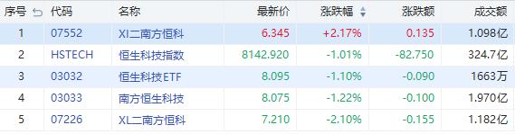 今日恒生科技指数跌1.01%。其中,南方两倍做多恒科(07226.HK)跌2.1%,成交额1.18亿港元;南方两倍做空恒科(07552.HK)涨2.17%,成交额1.09亿港元。