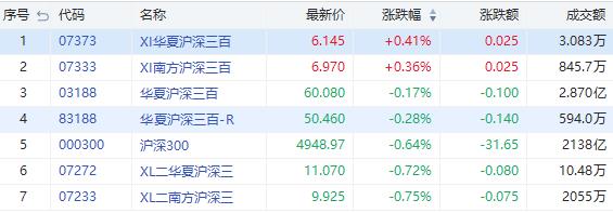 沪深300指数跌0.64%。其中,南方做空沪深三百(07333.HK)涨0.36%,成交额845.7万港元;南方两倍做多沪深三百(07233.HK)跌0.75%,成交额2055万港元。