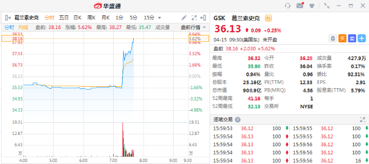 截至发稿,葛兰素史克(GSK)盘前涨幅扩大至5.62%。