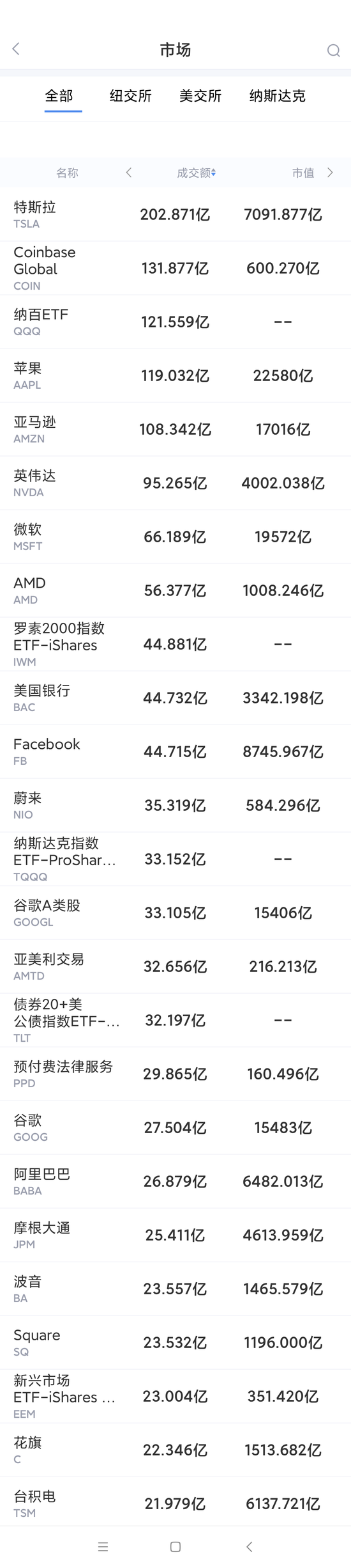 昨日刚刚上市的次新股、最大虚拟货币交易所Coinbase (COIN)连续第二日成为成交额亚军,该股收跌1.7%,成交131.9亿美元。在IPO上市首日,Cathie Wood的Ark Investment Management为旗下三只基金购买了约2.46亿美元的这只股票。