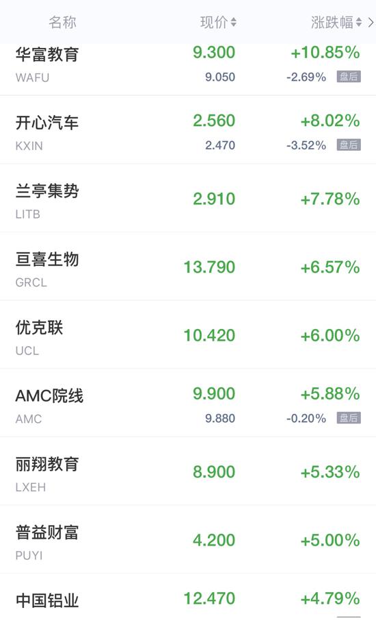 华富教育涨近11%,开心汽车涨超8%,兰亭集势涨超7%,中国铝业涨近5%,知乎涨超3%,携程、南方航空、流利说涨超1%,腾讯ADR涨近1%。