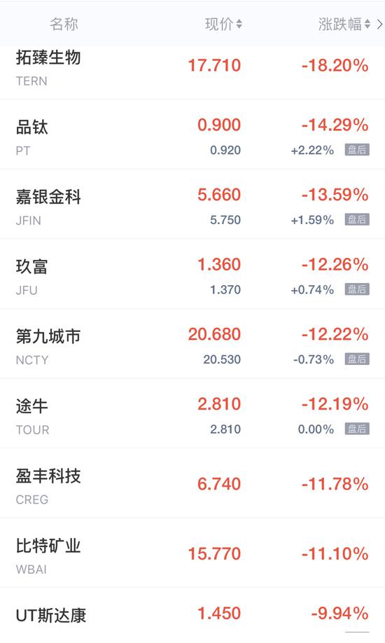 品钛跌超14%,嘉银金科跌超13%,途牛跌超12%,趣头条跌近7%,网易有道、名创优品、跟谁学跌超4%,百度、陌陌跌近3%,虎牙跌超2%,爱奇艺跌超1%。