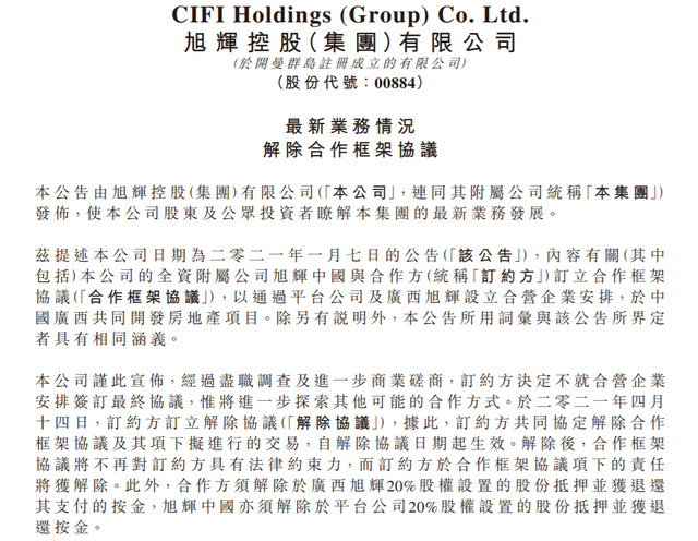 4月14日晚间,旭辉控股集团发布公告称,将解除与“广西一哥”彰泰集团的合作框架协议。对于合作终止的原因,公告给出的解释为“经过尽职调查及进一步商业磋商,订约方决定不就合营企业安排签订最终协议,将进一步探索其他可能的合作方式”。伴随着合作终止,双方将解除各自的股权抵押并退还所支付的定金。
