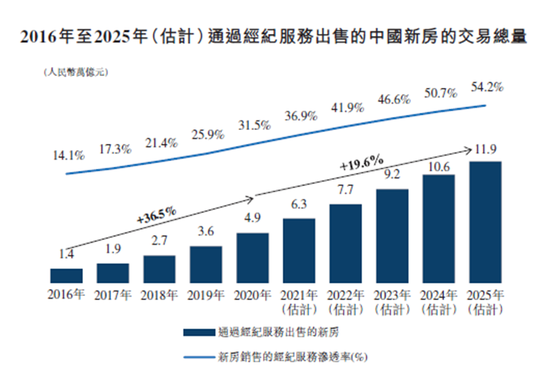 根据艾瑞咨询,于2020年,通过经纪服务出售的新房的交易总量达到人民币4.9万亿元,并预期于2025年以复合年增长率19.6%进一步增长至人民币11.9万亿元。