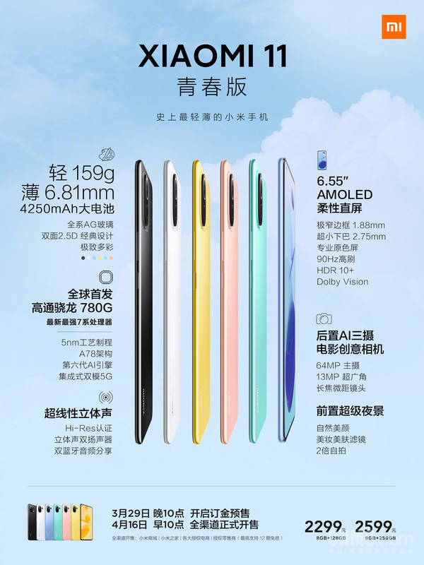 4月16日10点,小米首款折叠屏手机—小米MIX FOLD将在万众期待中迎来震撼首销,销售渠道覆盖线上线下全平台,售价9999元起。与小米MIX FOLD同步开启首销的,是史上最轻薄的小米手机—小米11青春版,起售价2299元,开售时间同样为4月16日10点。