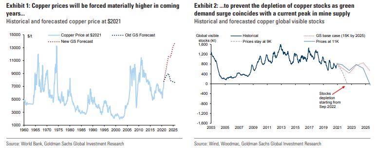 高盛新近报告以“铜是新的原油”为标题,描绘了这样的铜价高涨前景:因为铜对全球各国推动绿色能源转型不可或缺,未来绿色能源革新相关的需求将激增,而当前的铜市场供应紧张,如果保持当前的价格水平,到2023年、即后年初,全球的铜库存就将耗尽。只有比目前高得多的价格才能刺激铜的供应缺口得到补充,铜价注定会飙升。