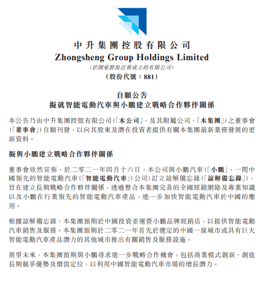 4月16日消息,中升控股在港交所公告,公司与小鹏汽车逐步谅解备忘录,逐步建立长期战略合作伙伴关系,通过整合集团完善的全国经销网络及专业知识以及小鹏在行业领先的智能电动汽车产品,进一步加快智能电动汽车于中国的应用。