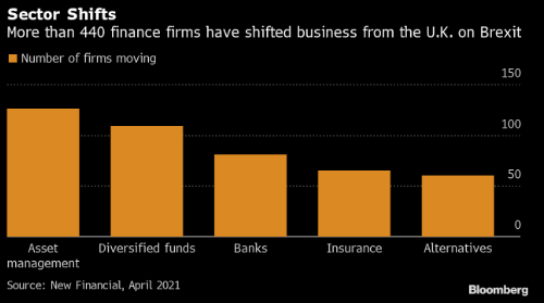 英国脱欧已促使440多家金融公司将至少部分业务、员工、资产或法人实体从英国迁到欧盟。