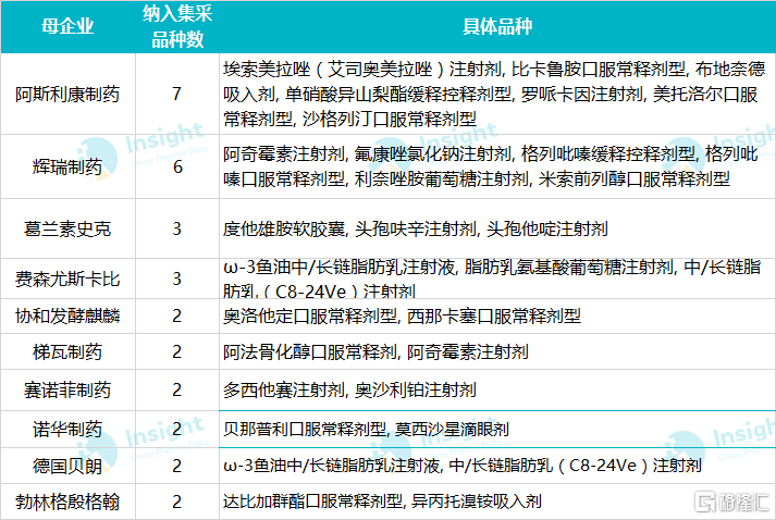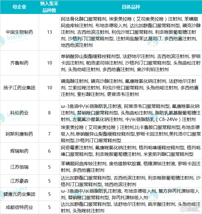就目前 Insight 数据库统计,本次纳入品种超过 5 个的企业共有 9 家,其中以中国生物制药、齐鲁制药、扬子江、科伦药业纳入品种数量位居前列,预计受本次集采影响较大。