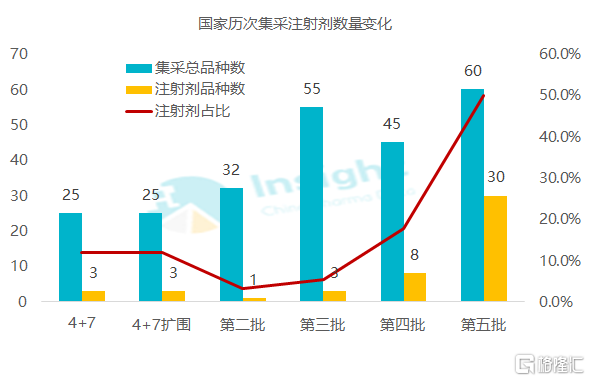 话不多说,第五批集采是国家历次集采中纳入品种数量最多的一次,本次共 60 个品种,涉及 207 个品规,其中注射剂有 30 个品种,远超前几次注射剂品种之和。