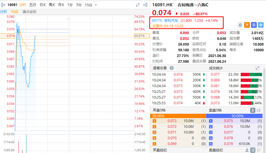 相关窝轮方面,吉利海通—六购C大涨60.87%,成交额1405万港元,其行使价为26.85港元,2021年06月30日到期,溢价率达27.73%。