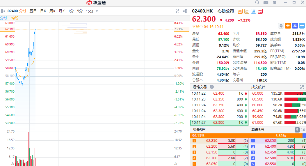 华盛资讯4月16日消息,心动公司盘中获快速拉升,现涨7.23%,报62.3港元每股,成交额达1.528亿港元,最新总市值为299.3亿港元。