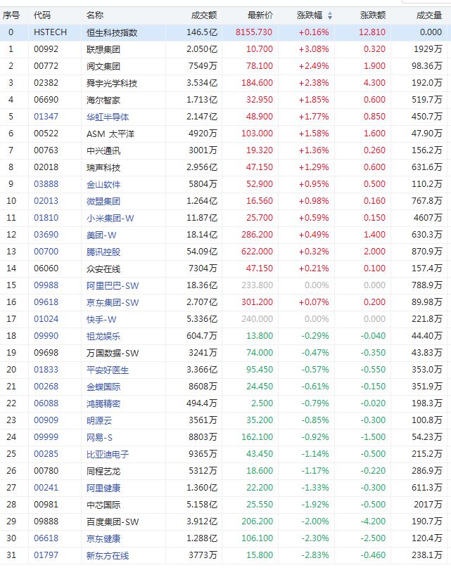 腾讯控股涨0.32%;美团-W涨0.49%。