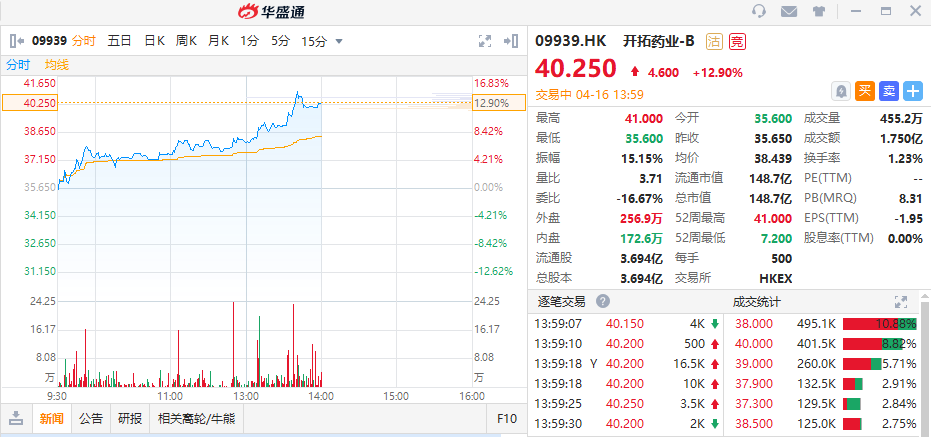 华盛资讯4月16日消息,4月15日,开拓药业宣布,正式获得国家药品监督管理局颁发的临床试验通知书,同意基于蛋白降解嵌合体(PROTAC)技术开发的靶向新型雄激素受体(AR)的GT20029(酊/凝胶)开展临床试验,用于雄激素性脱发和痤疮的治疗。这是全球首个外用AR-PROTAC,同时也是首款进入临床的外用PROTAC化合物。受此消息提振,开拓药业早盘走高,午后继续发力。截至发稿,开拓药业-B上涨12.9%,现报40.25港元每股,总市值148.7亿港元。