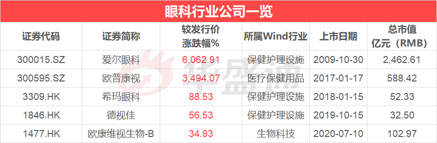 港股中的眼科公司尽管上市时间较A股相关公司短,但发展潜力也不可小觑。其中腾讯投资的民营眼科连锁希玛眼科上市至今累计涨幅达88%,视力矫正服务企业德视佳上市至今涨幅达56%。