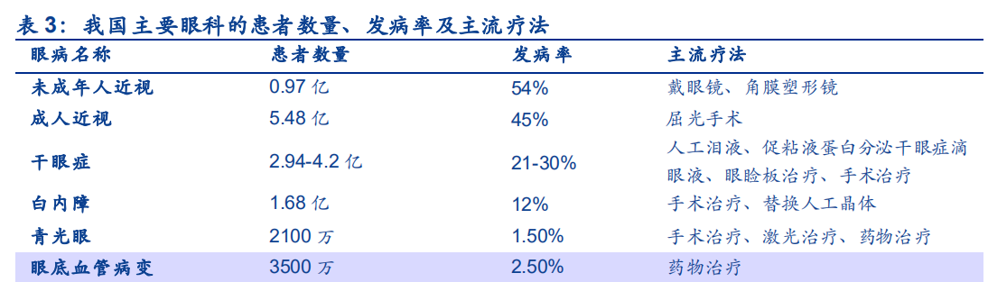 中国眼部疾病患病人数超过10亿,其中近视和干眼症患者占人口总数60%以上,且随着老龄化不断加剧,白内障、青光眼、老花眼等与年龄高度相关的眼病发病率不断提高。