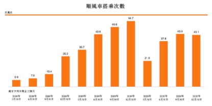 在经历多年的发展后,时至今日嘀嗒出行已然由行业里不起眼的“后浪”,挤进了共享出行赛道圈里的头部位置。根据弗若斯特沙利文报告,按2019年顺风车搭乘次数计算,公司占据顺风车市场66.5%的份额。司机端方面,截至2020年12月末,嘀嗒出行在全国366个城市提供顺风车平台,拥有约2070万名注册私家车主,包括约1080万名认证私家车主。乘客端方面,自嘀嗒出行成立至2020年末,公司为约4200万名顺风车乘客提供服务。2018年-2020年,嘀嗒出行顺风车平台分别产生约4820万次、1.79亿次、1.46亿次搭乘,同期交易总额分别为19亿元、85亿元、81亿元。