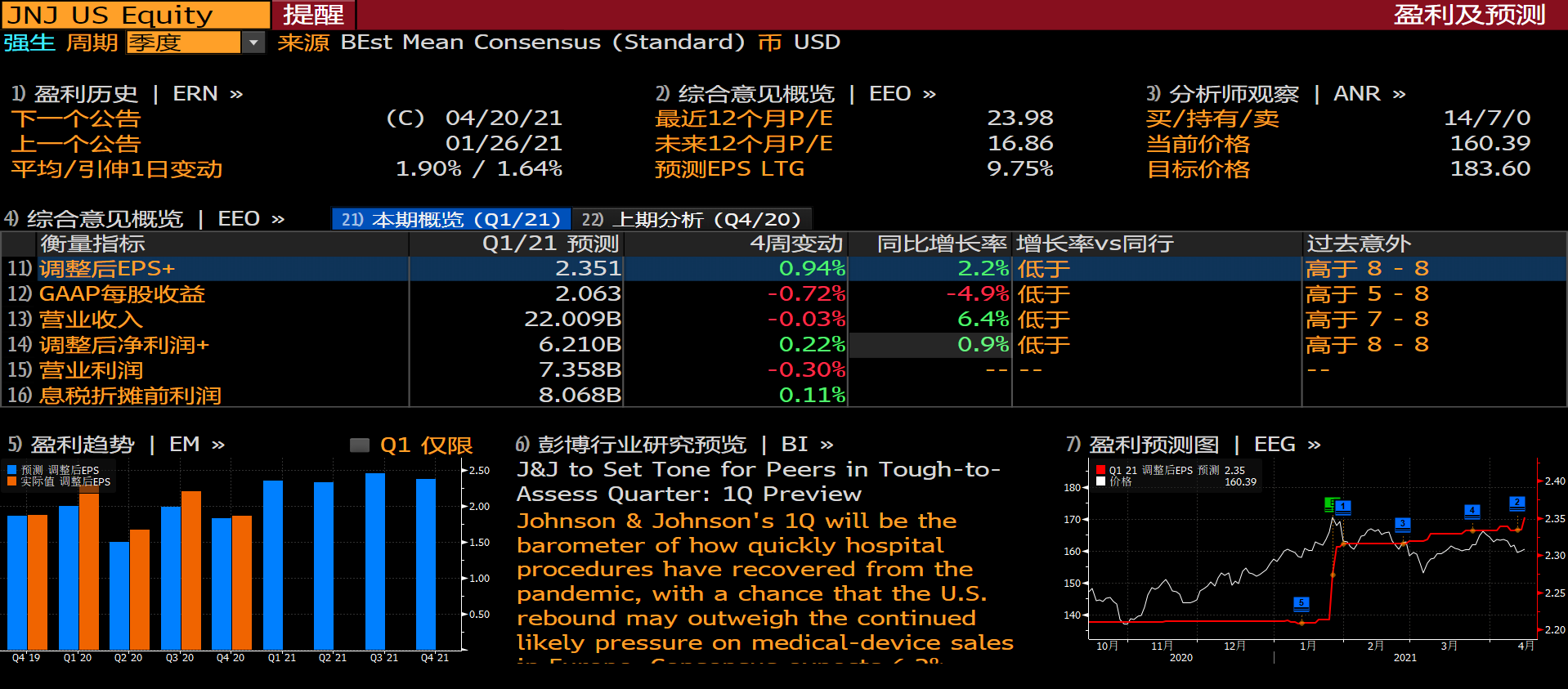强生将于周二(20日)美股盘前公布其2021年Q1财报。据彭博分析师预期,2021年Q1强生营收为220亿美元,同比增长6.4%;调整后净利润为62.1亿美元,调整后每股收益为2.35美元。