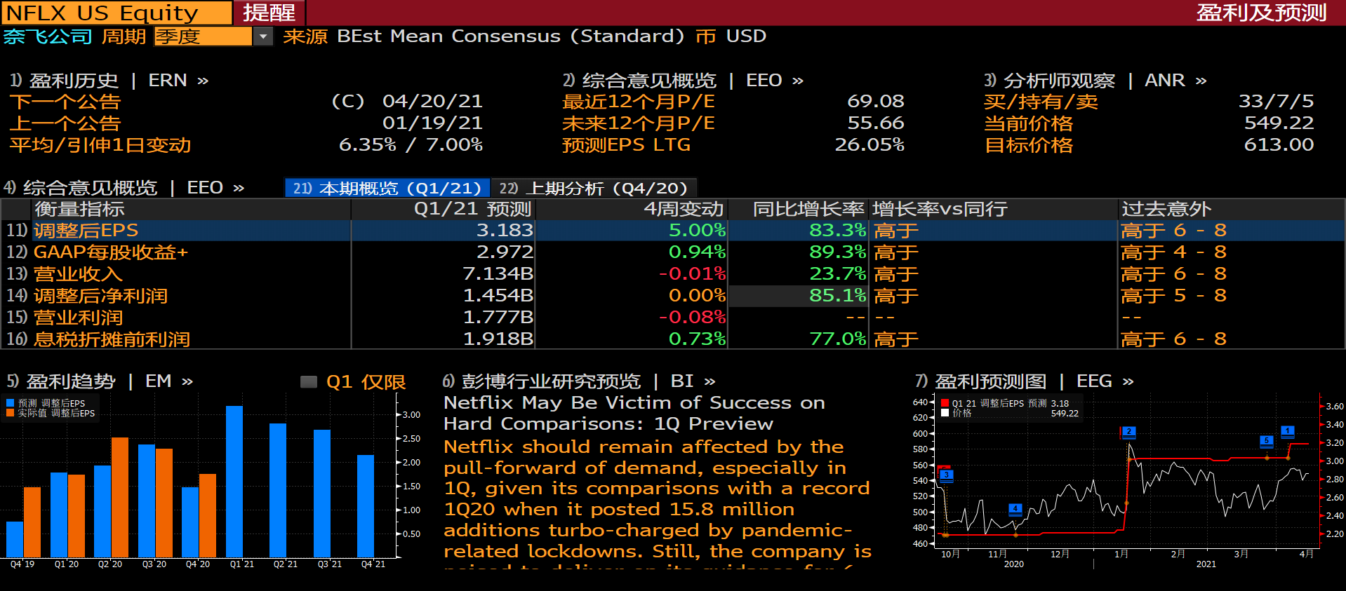 流媒体视频服务提供商Netflix宣布,将于4月20日发布2021年第一季度财报。据彭博分析师预期,2021年Q1奈飞营收为71.34亿美元,同比增长23.7%;调整后净利润为14.54亿美元,同比大增85.1%;调整后每股收益为3.18美元。