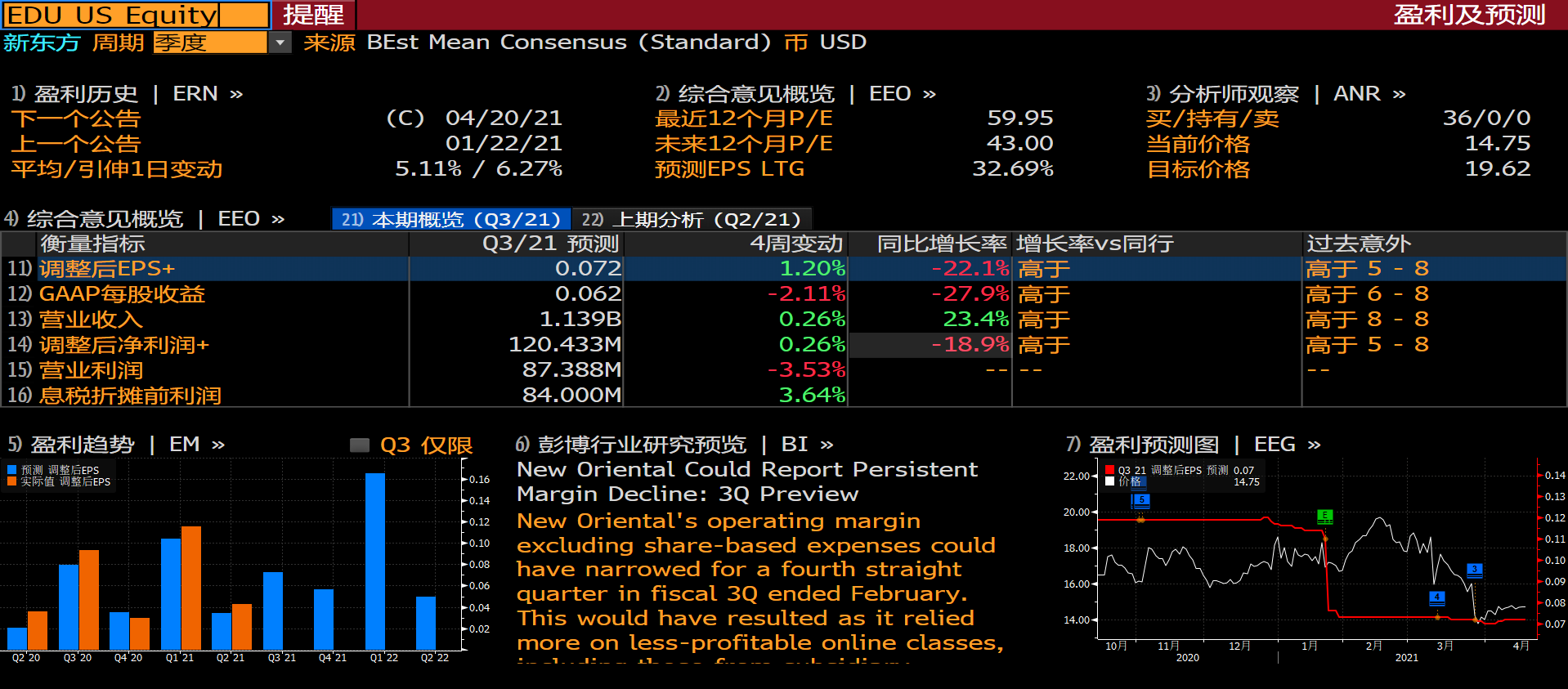 新东方将于4月20日美股盘前公布2021年Q3业绩。需要注意的是,新东方财年为每年的6月1日至第二年的5月31日。据彭博分析师预期,2021年Q3新东方营收为11.39亿美元,同比增长23.4%;调整后净利润为1.204亿美元,同比减少18.9%;调整后每股收益为0.07美元。