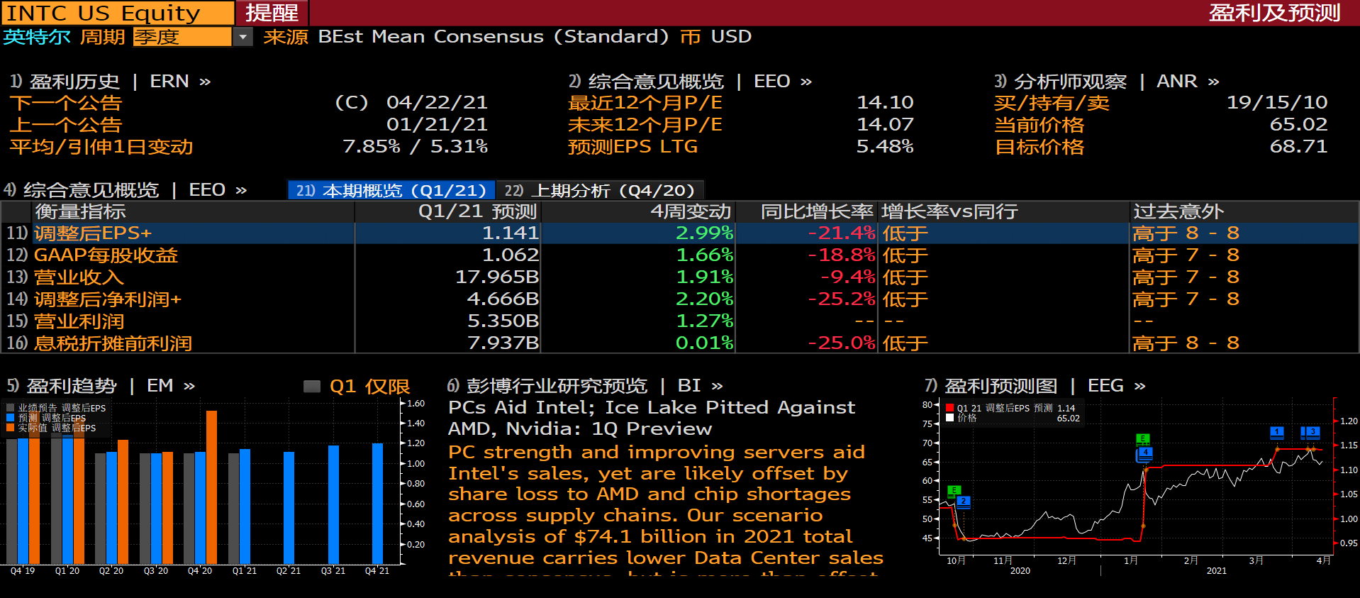 英特尔将于周四(22日)公布其2021年Q1财报。据彭博分析师预期,2021年Q1英特尔营收为179.65亿美元,同比减少9.4%;调整后净利润为46.66亿美元,同比减少25.2%;调整后每股收益为1.14美元。