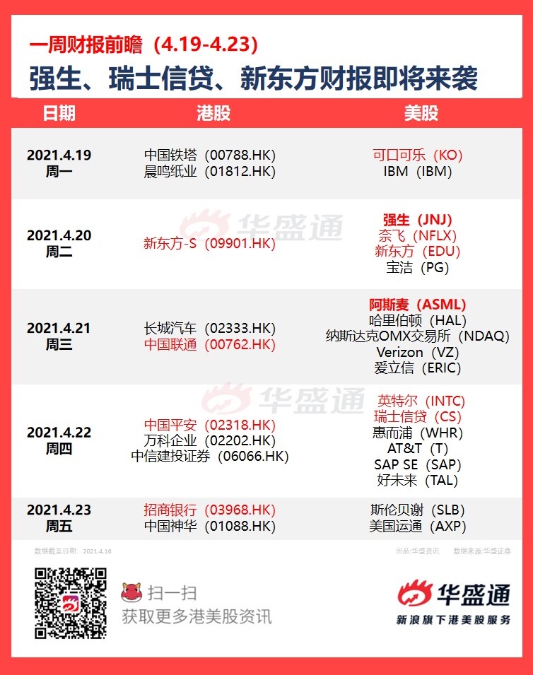 而美股市场则是迎来了多只明星股Q1财报,其中有巴菲特钟爱的可口可乐、生产新冠疫苗的强生、流媒体视频服务提供商的奈飞、教育股新东方、荷兰光刻机制造商ASML阿斯麦、“主动请缨”为汽车芯片代工的英特尔、刚遭遇对冲基金Archegos爆仓事件的瑞士信贷等都将公布财务数据。